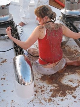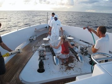The night before last I had the most horrifying yet amusing experience! Normally most 'yachties' get to cross the equator during the regular Med to the Caribbean trip. I've never done a huge crossing until now and we've crossed the equator going from PNG to Hong Kong. Anyway, it is tradition that anyone doing so for the first time be punished for not asking Neptune for permission (or something along those lines). On Thursday, our 2nd officer pulled me and the other stews down to the forepeak (hatch at the front of the boat) for an emergency briefing. I had my safety and security induction earlier in the day and the whole thing seemed odd. It was a strange time to do it and the other stews kept giggling. Anyway, the rest of the crew locked us in there and I thought they were just having a laugh. When the hatch opened there was our deckhand Dan in a white overall and I knew I was in deep. They pulled me out, tied me to the anchor chain controls with cable ties, rope and a noose around my neck. All the crew came out and the chef had apparently spent 24 hours concocting something made of mince, chicken that had been in the oven for 24 hours, beef that had been left in the baking engine room, fish sauce and anchovies...the lot. Disgusting! So he came out with this huge bowl, gave it to Dan who tipped it over my head. It was awful! They then hosed me down. The smell was disgusting, it went in my eyes, all down my clothes, my pants....everywhere. It was so so funny. I was laughing and crying at the same time...brilliant! Before they tipped everything over, the Captain came out dressed as Neptune and read a speech about my various 'crimes' which was classic. Lots of wine, cheers and photos...some of which are attached. It took me ages to get the chunks of meat out of my hair afterwards and I'm still traumatised!!!