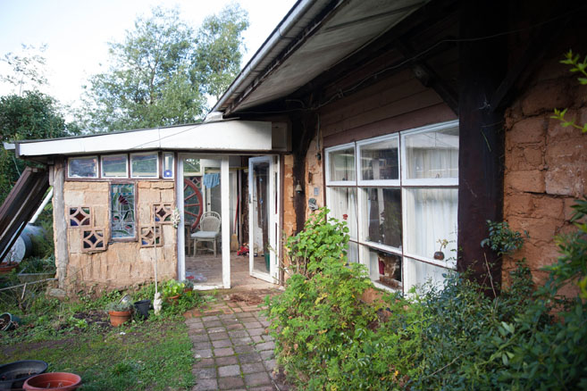 Greenhouse at the front; toilet, airlock-bootroom and workshop at the back, were stage 3. (There is NOTHING wrong with a pit toilet for a while. Trees love being planted on top of a well rotted hole-ful of humanure.)