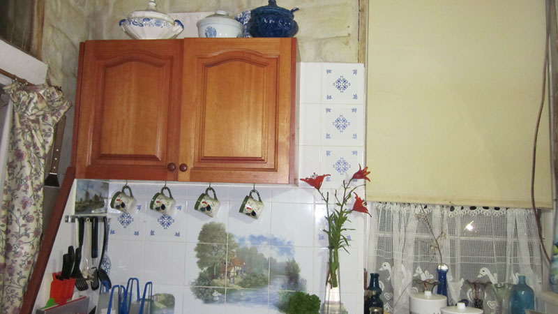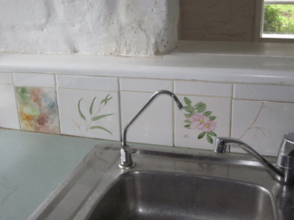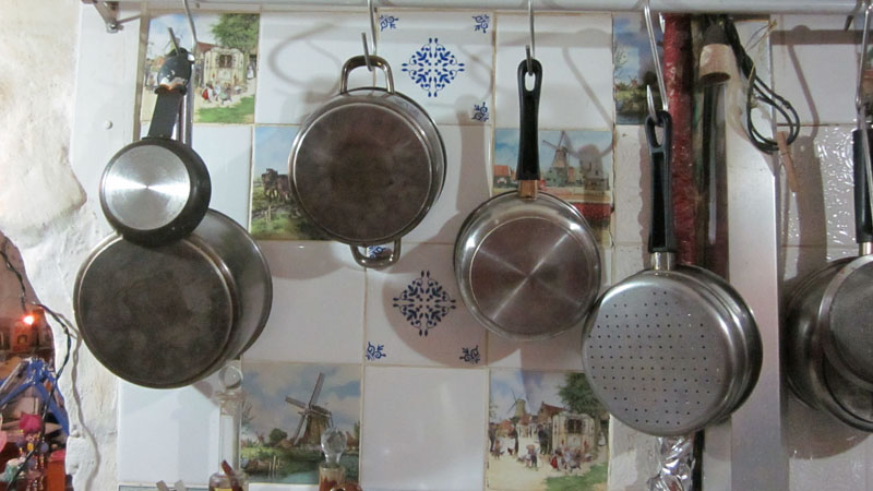 Some tiles are set into the earth wall. Plates and clock hang on nails simply hammered into the centre of a mudbrick.