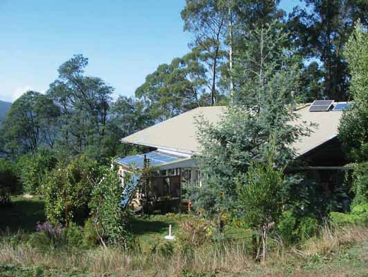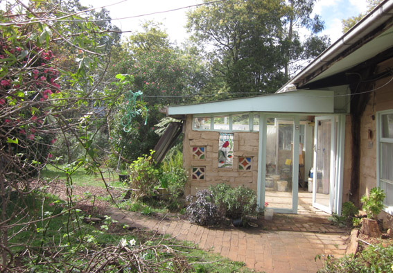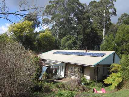 The front pic shows the attached greenhouse (every house in Victoria should have one), and the tiny solar panel array -- what we could afford, and we made do with it. Moora Moora is proud to have no connection to the electricity grid. Compare this pic with the one at the top of the page, showing the new set of solar panels. The house is now also on Glen Morris's microgrid.
