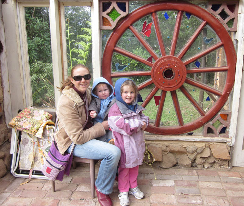 My mother-in-law made this picture with several needle-crafts including applique and embroidery. It was ready long before the house, so I built a recess specially for it. The wall is rammed earth up to there, then mudbrick piers. The ceiling is recycled car case plywood.