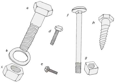 h) Coach screw: shank is thicker than thread; coarse thread bites into timber; end is