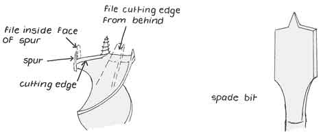 Sharpen an auger with a 'fine cut' flat file to put a shine on all cutting edges. Don't touch the outside face of the cutting head, or you reduce its diameter. Then the higher parts will jam in the hole. Leave the screw alone too.