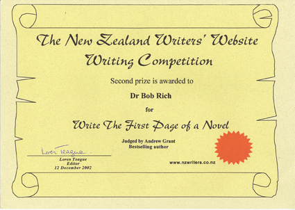 The first page won the second prize out of 281 entries in the 'first page' contest held by the New Zealand Writers in November, 2002.