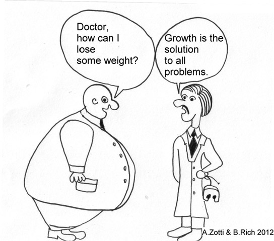 All the problems you see around you are due to society's addiction to economic growth. The solution offered to deal with the problems is economic growth, like this: